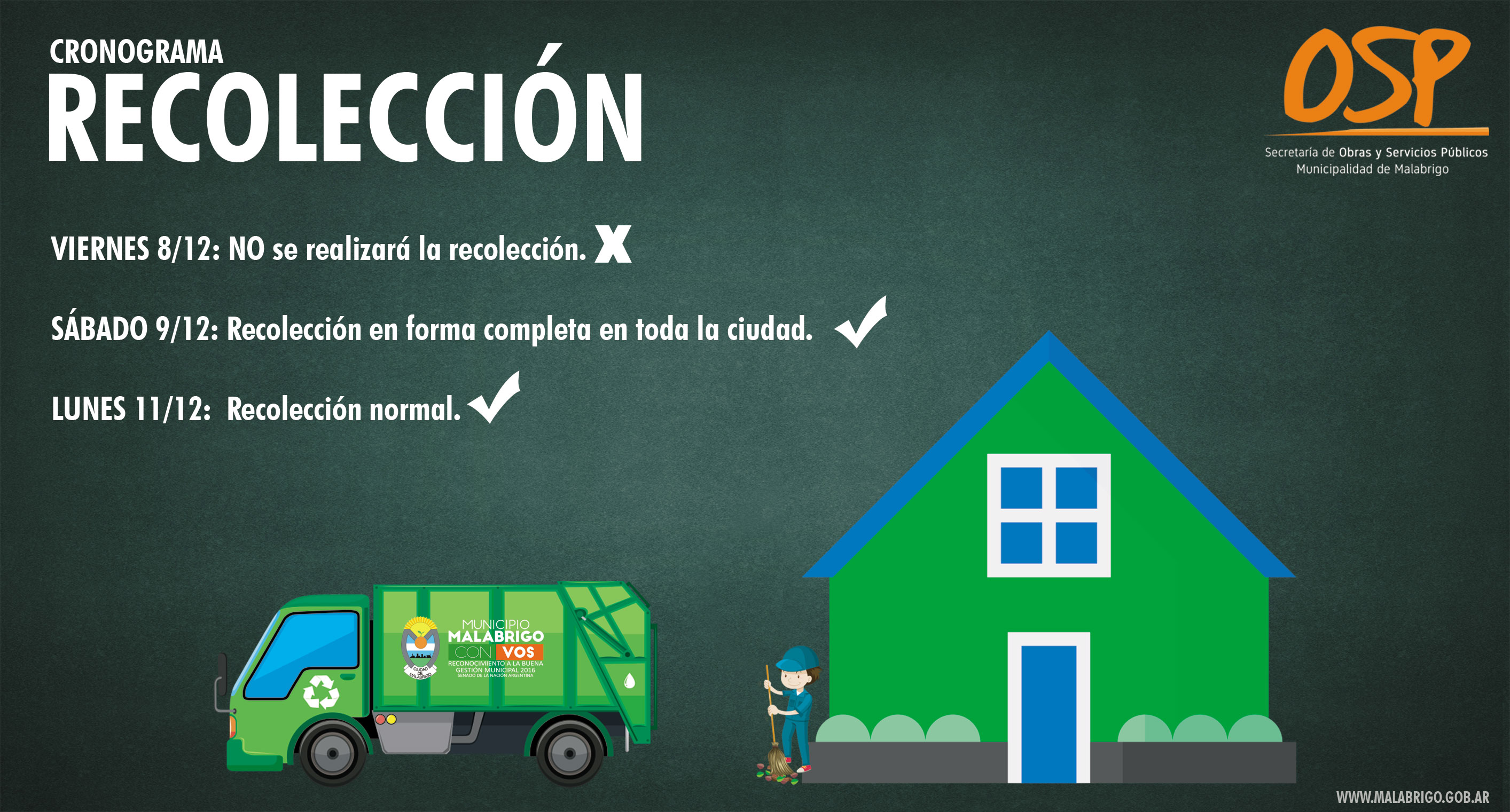 La Secretaría de Obras y Servicios Públicos de la Municipalidad de Malabrigo informa el cronograma de recolección de residuos para este fin de semana.