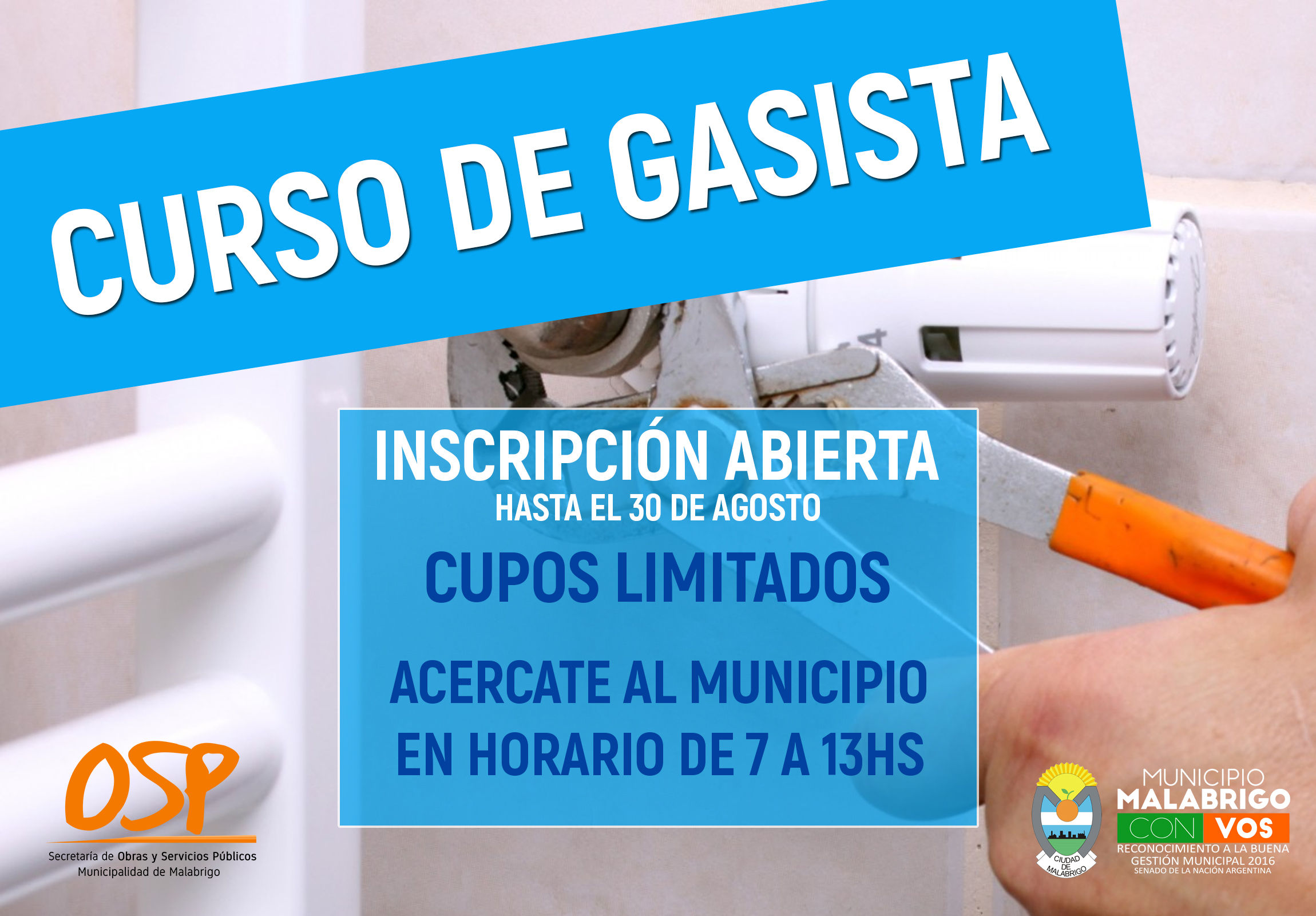 La Secretaría de Obras y Servicios Públicos de la Municipalidad de Malabrigo informa e invita a todos los interesados a inscribirse al Curso de Gasista que de llevará adelante desde el próximo 15 de septiembre.