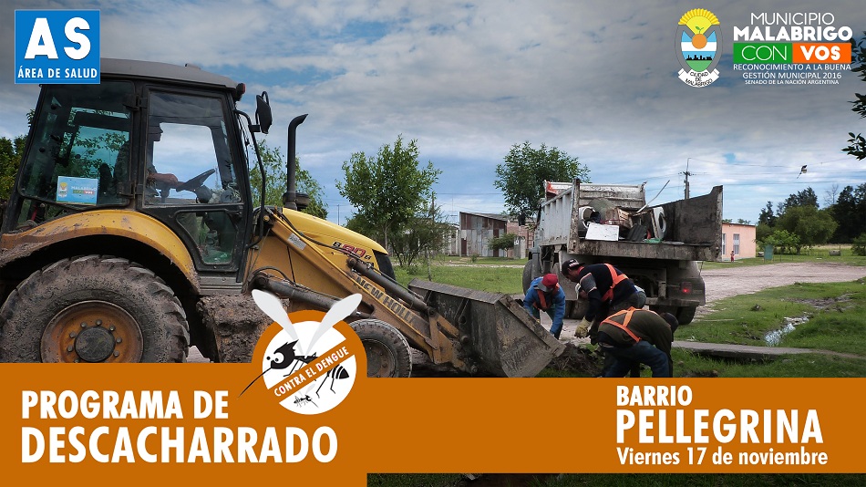 La Secretaría de Obras y Servicios Públicos junto al Área de Salud de la Municipalidad de Malabrigo informan que este viernes 17 de noviembre continuarán los trabajos de descacharrado y prevención contra el Dengue en todo el barrio Pellegrina.
