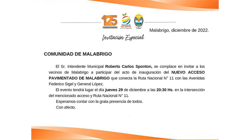 Invitación especial a la inauguración del nuevo acceso pavimentado de Malabrigo.