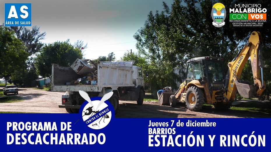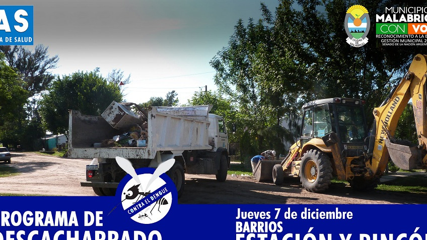 La Secretaría de Obras y Servicios Públicos junto al Área de Salud de la Municipalidad de Malabrigo informan que este jueves 7 de diciembre continuarán los trabajos de descacharrado y prevención contra el Dengue en todo el Barrio Rincón y Estación.